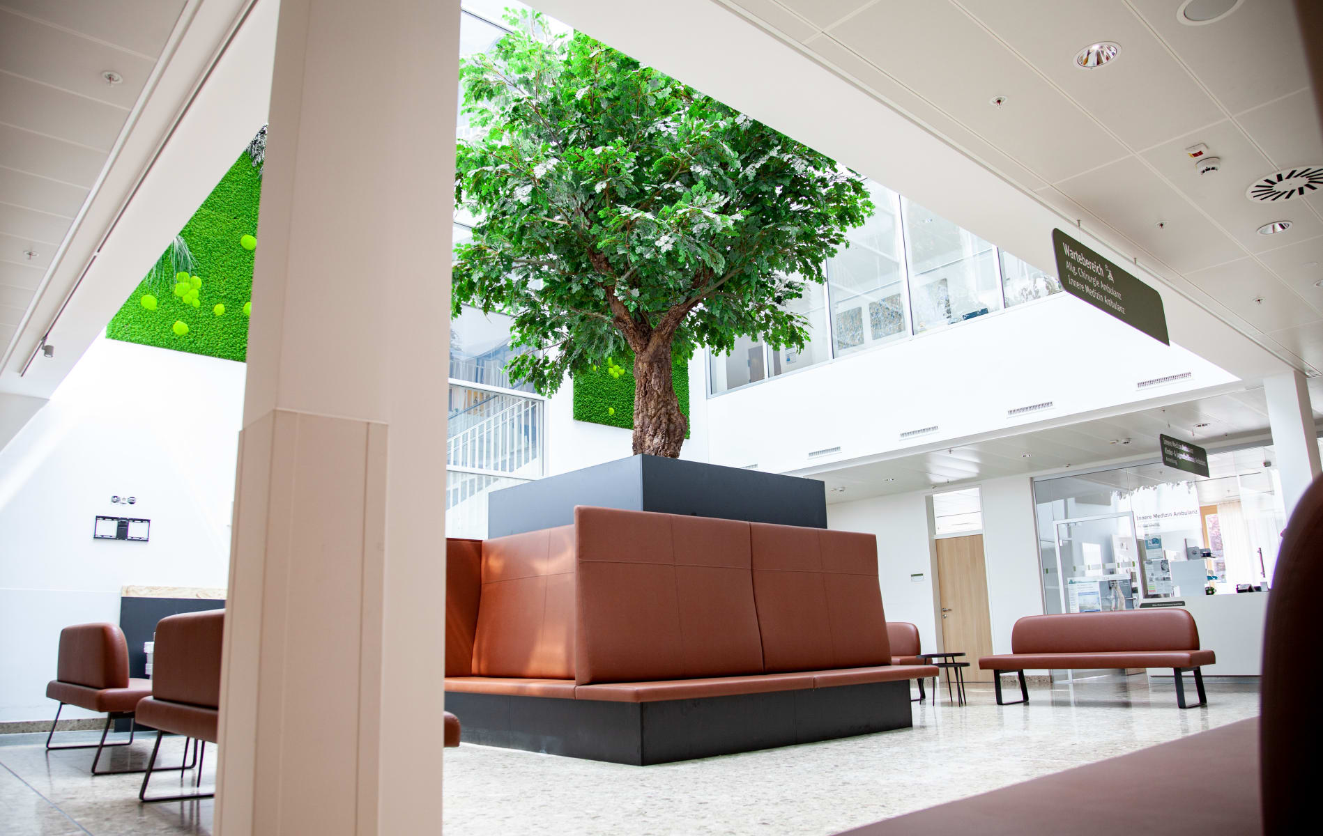 Das Atrium wurde in eine Grüne Oase verwandelt. Der Wartebereich bietet Besuchern, Pflegepersonal und Patienten einen Ort der Entspannung. Die Begrünung des Innenraums hilft dabei nicht nur dem Wohlbefinden sondern verbessert auch die Akustik der Räumlichkeiten. Dabei setzten die Innenarchitekten Möbel von Forcher Tirol ein, um eine harmonische und gemütliche Atmosphäre zu schaffen.