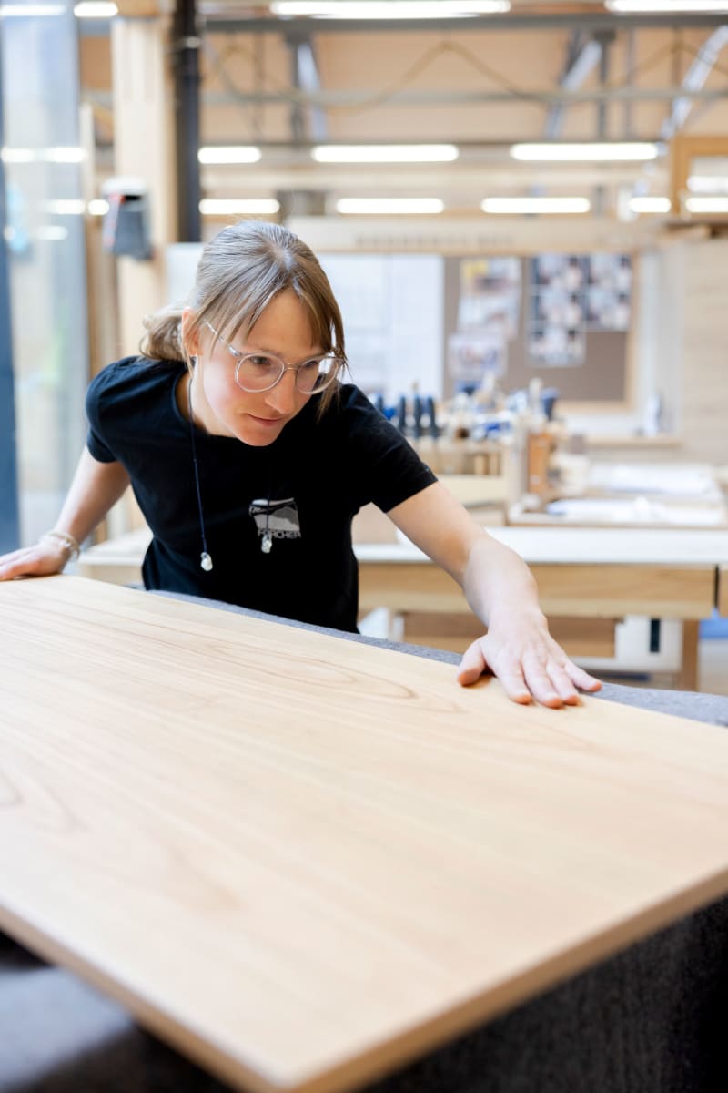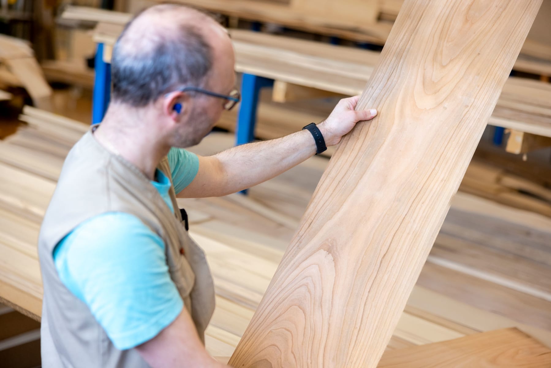 Mit geschultem Blick wählt der Tischlermeister jedes Furnierblatt aus und komponiert es zu einem harmonischen Gesamtbild. Das Furnieren von Möbeln ist eine nachhaltige Verwendung von Holz und bietet mehr Gestaltungsmöglichkeiten als der Massivmöbelbau.