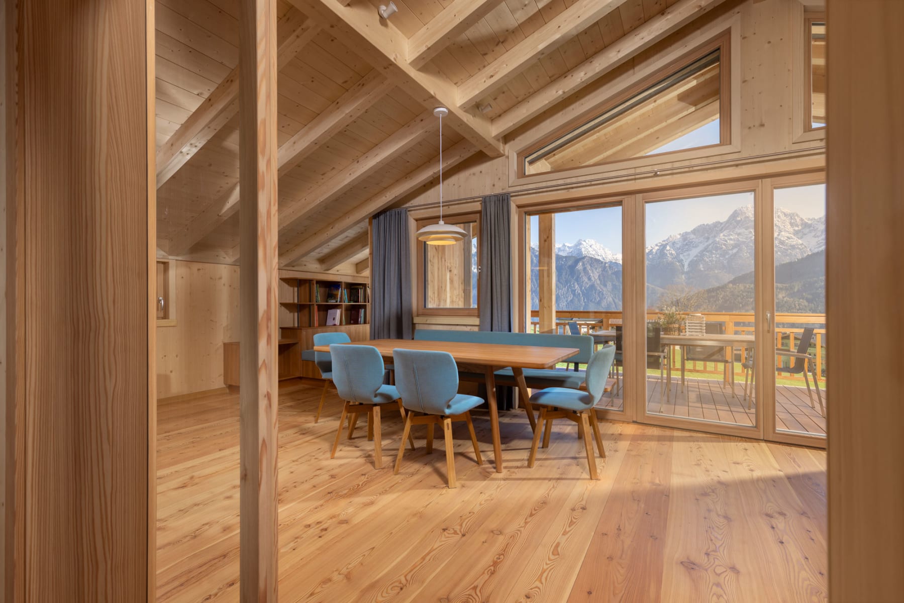 Warme Holztöne, klare Linien und liebevolle Details schaffen eine Atmosphäre zum Wohlfühlen. Esszimmerserie in Rüster: Tisch und Bank Jakob in Sonderausführung, Stoff Aria