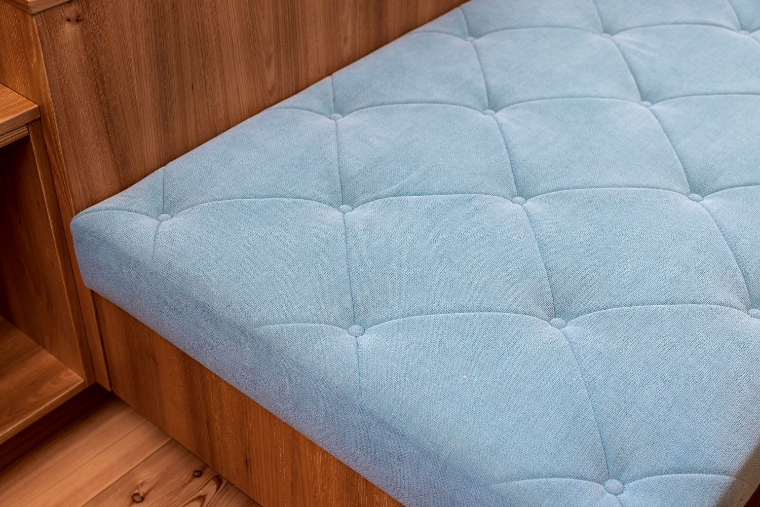 Die Liege mit Knopfheftung verbindet schlichte Form und solide Handwerkskunst.